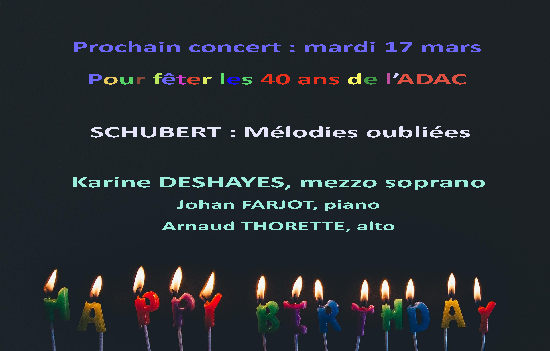 Un événement viendra marquer cette nouvelle programmation : les 40 ans de l’ADAC. Nous recevrons, pour illustrer ce bel événement, la mezzo-soprano française Karine Deshayes, à l’immense carrière qui lui permet de chanter sur les plus grandes scènes internationales et dont le timbre si expressif, saura vous émouvoir dans les mélodies oubliées de Schubert, accompagnée de l’Ensemble Contraste.